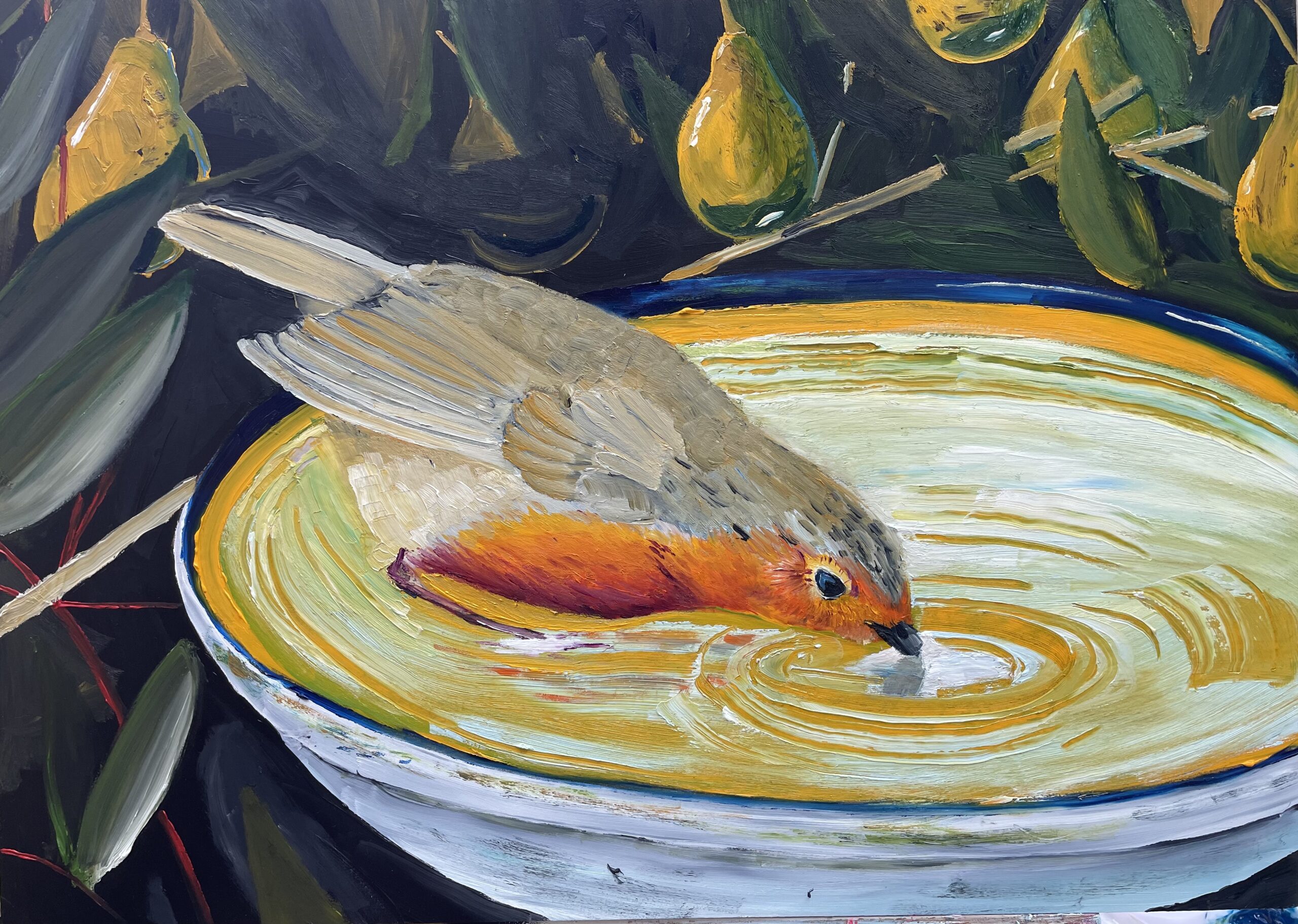 A thirsty Robin painted in oils on to an unframed wood panel.